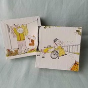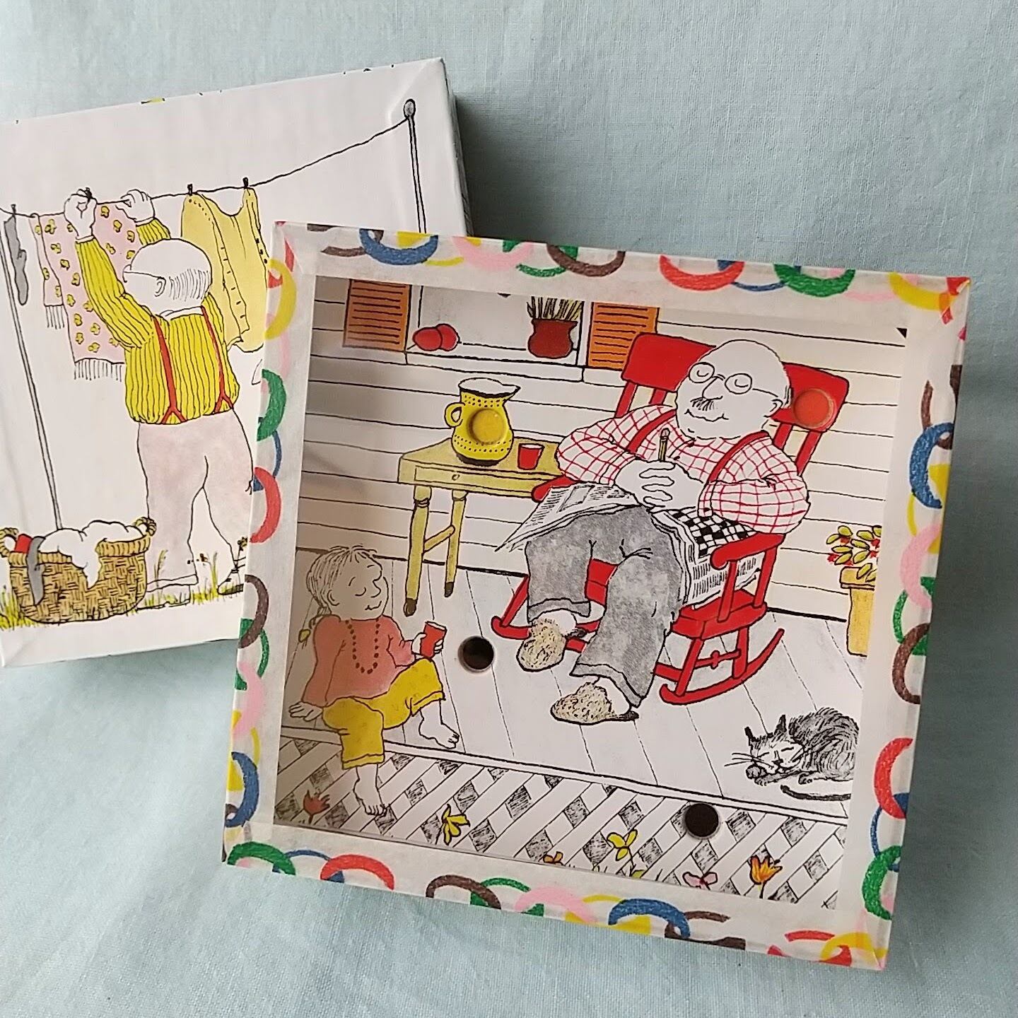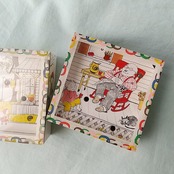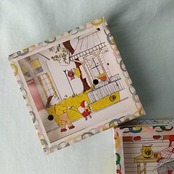 図書館の廃棄絵本のページからパーツを切り取り、紙の箱に仕立てました。紙箱の中はシンプルなゲームになっています。ビーズを穴の中にうまくはめるゲームのふたつ(こちらには落とし穴もあります)。