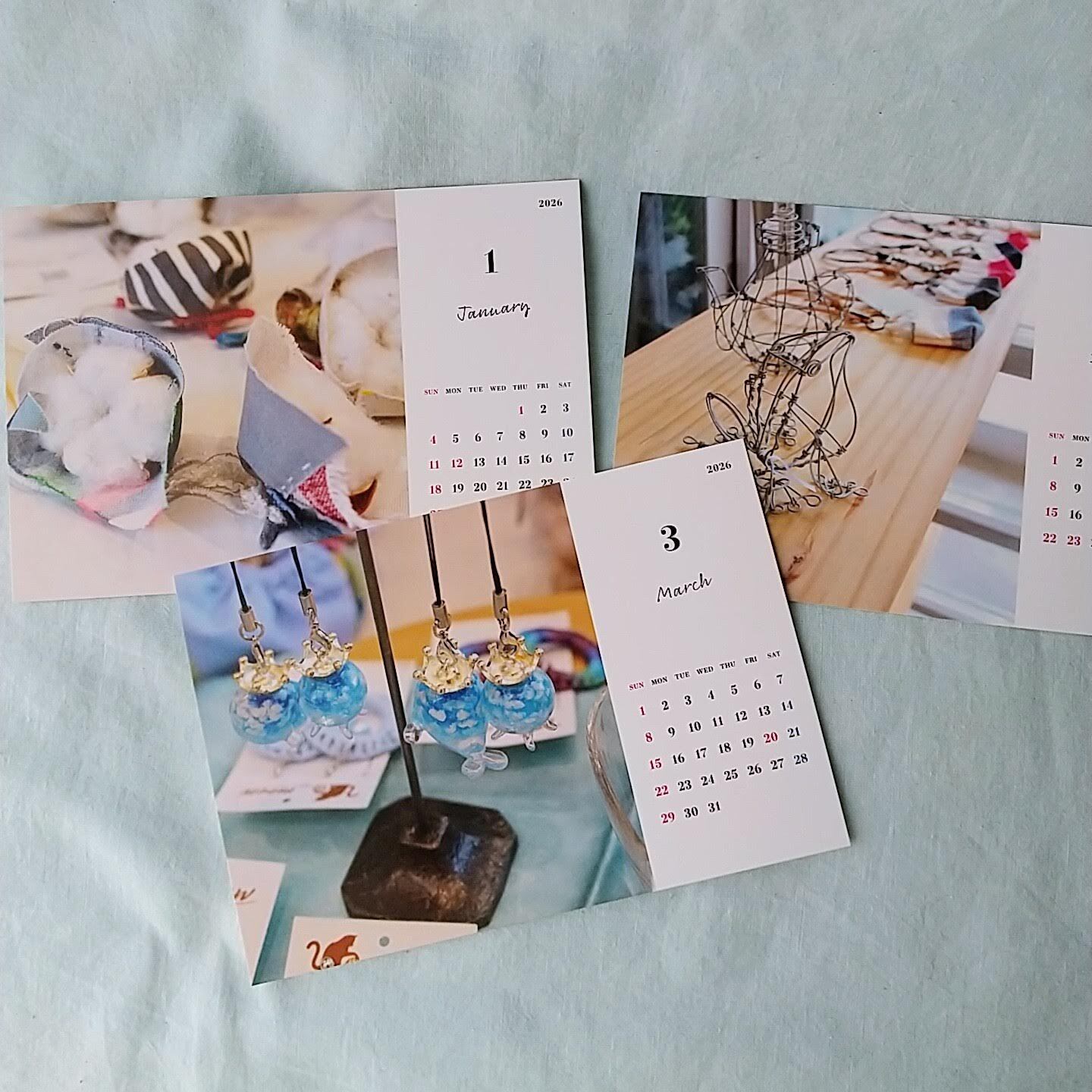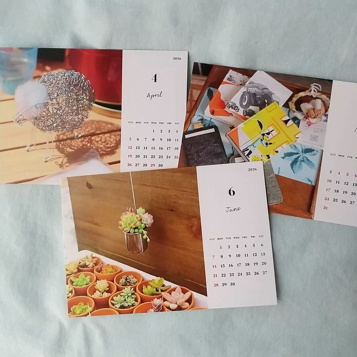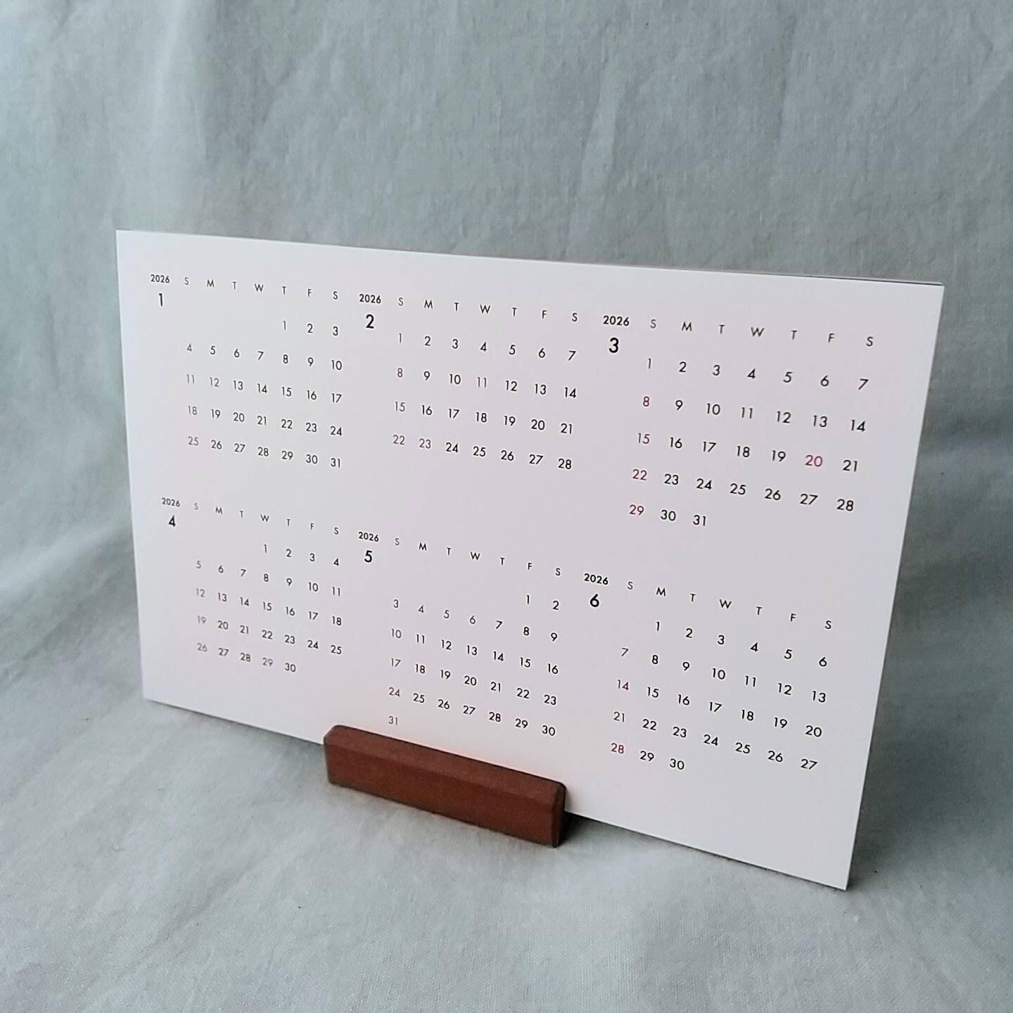 2026年1月始まりの全12枚。ポストカードサイズなので小さなスペースに飾れます。裏面はスケジュールの書き込みが可能です。木製スタンドの樹種はさまざまでランダムに梱包されているためお選びいただけません。予めご了承ください。