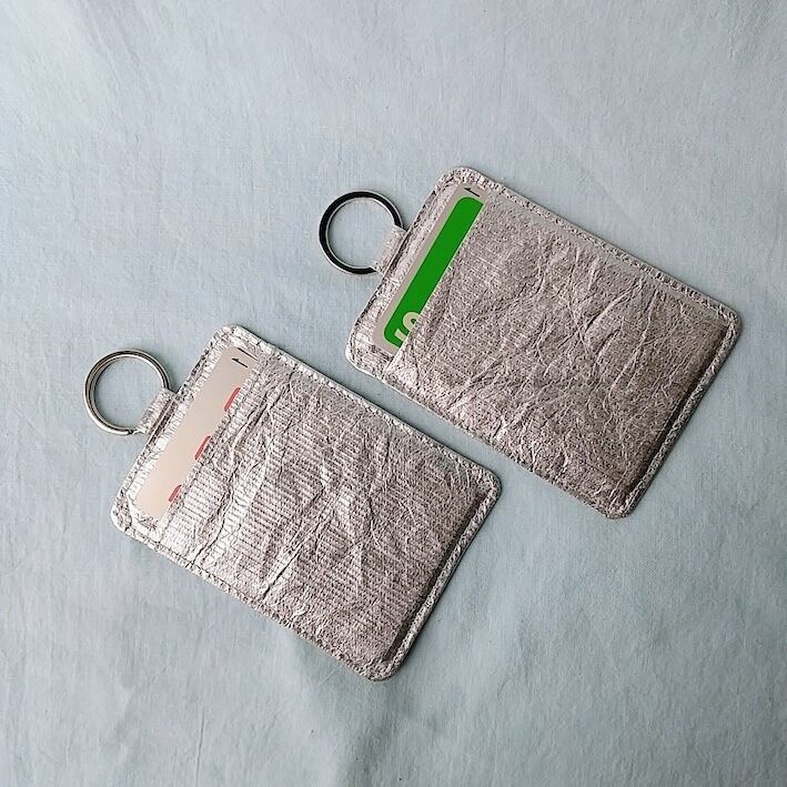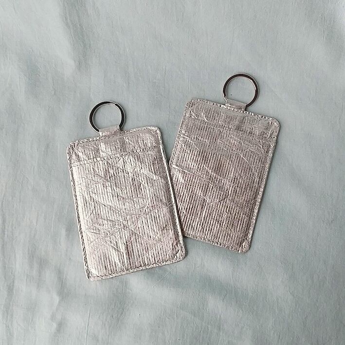 タイベック(Tyvek®︎)を使用したカードケース・シルバー。ソフトタイプのシルバータイベックなので、しなやかな感触です。両面にポケットがあるので2枚のカードを収納できます。タイベックの軽さも、いいところ。荷物を軽くしたい方におすすめ。