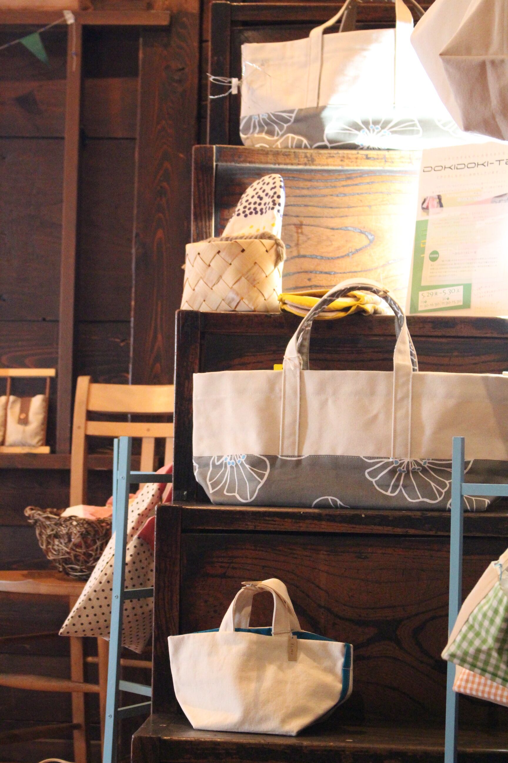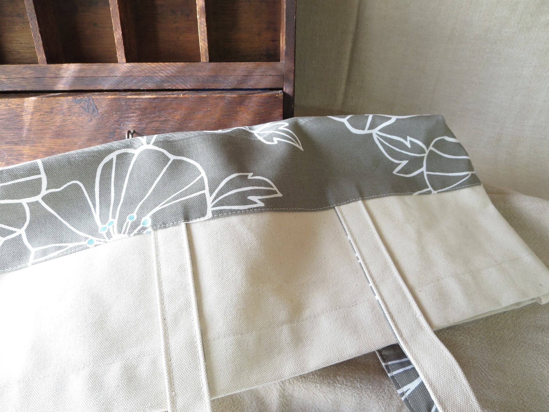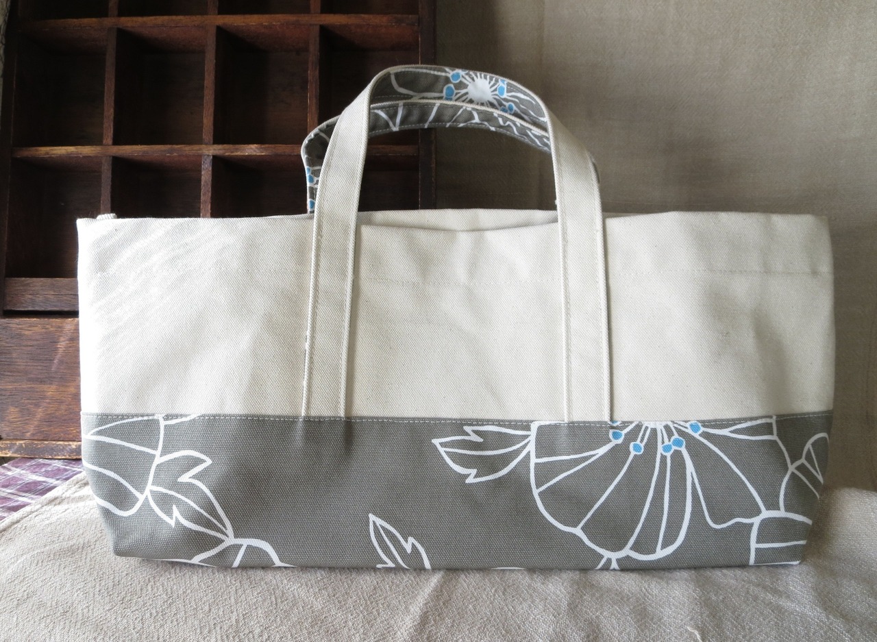 一升瓶を寝かせて運べるサイズのバッグ。ビール6缶パックも2つ入ります。生成り帆布に柄生地をアクセントで使っており、柄生地を変えてこれまでに数点製作しています。