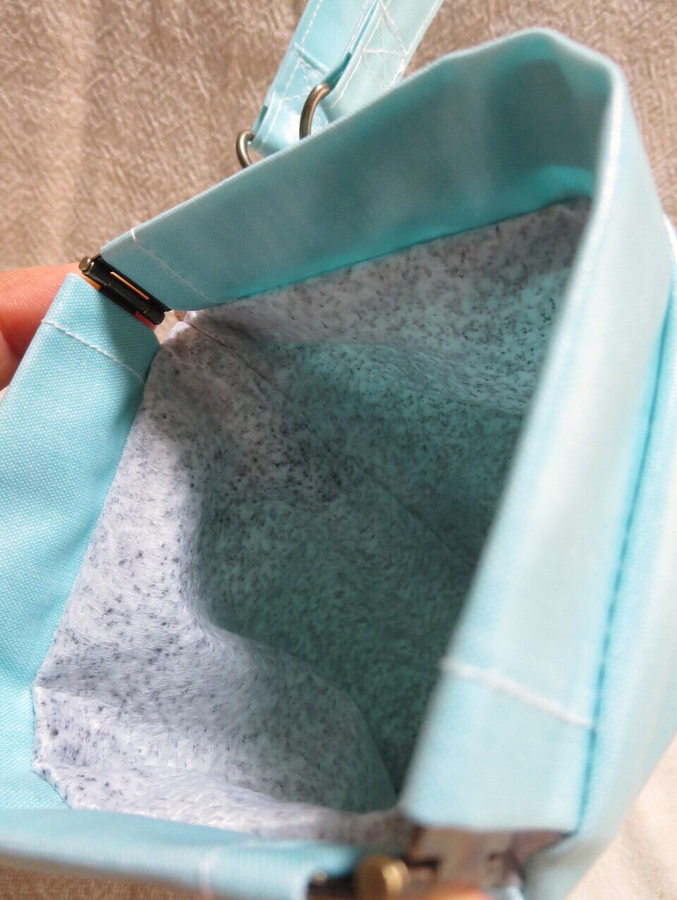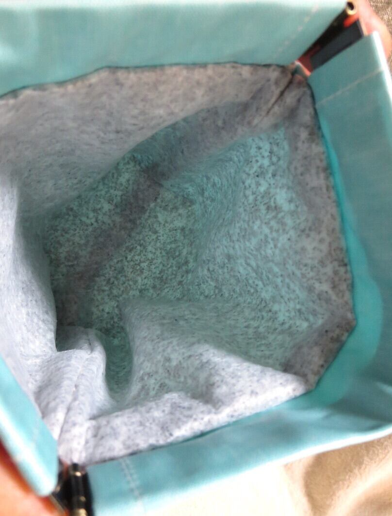 外側のミントグリーンの生地は、ラミネート加工生地(日本製)を使用、防水性と汚れに強い素材です。内側の生地は、特殊活性炭入り消臭シートを使用。消臭性能は5時間以上の天日干しで回復するので、繰り返し使えます!